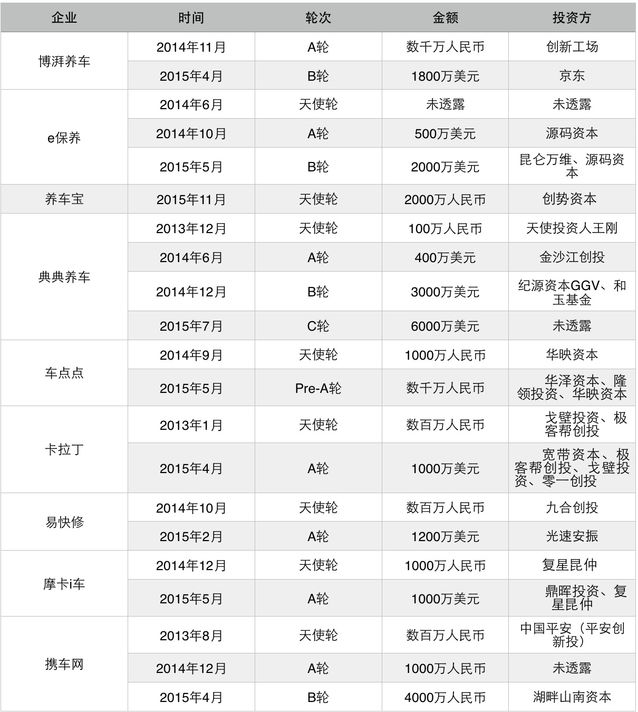 2015年上半年,養(yǎng)護(hù)O2O作為轎車后商場O2O的一個(gè)細(xì)分范疇也逐步升溫,包含博湃養(yǎng)車、典典養(yǎng)車、卡拉丁等在內(nèi)的多家公司都取得了新一輪融資。